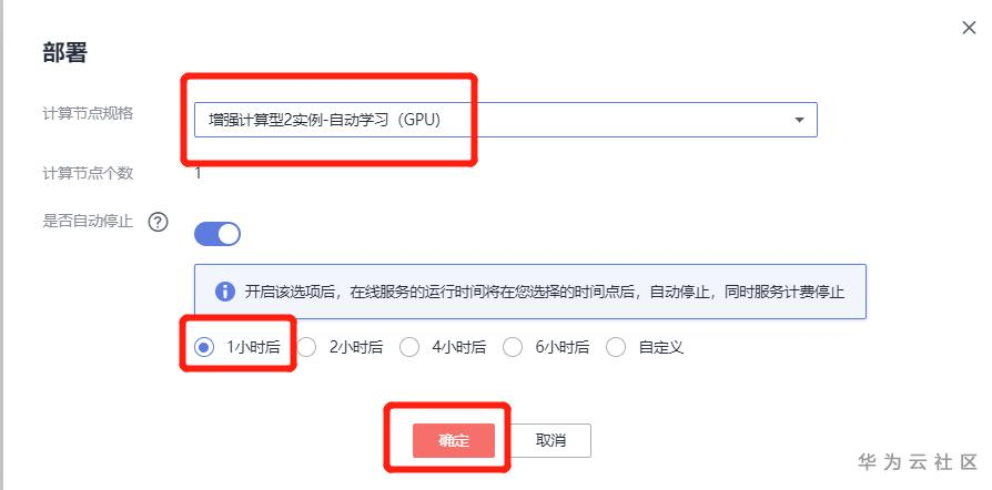 选择增强计算型-自动学习(GPU),选择自动停止,1小时后,点击确定,等待模型部署完成。