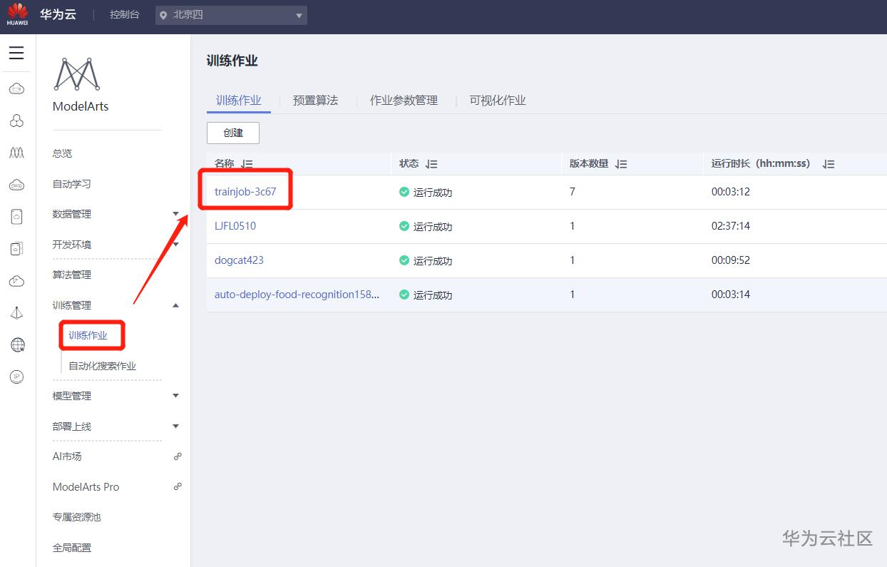 在控制台打开ModelArts,点击训练管理,选择训练作业,打开在1.4中创建的项目。