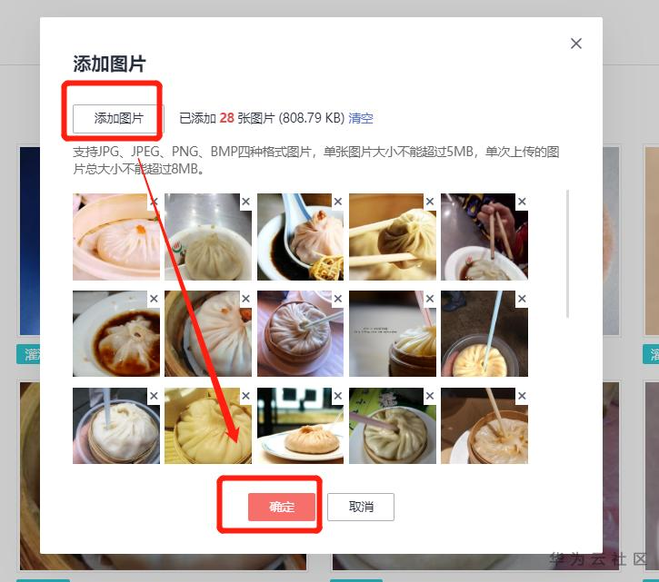 3.点击添加图片,分别导入foods_recognition_assi文件夹下train文件夹中灌汤包和柿子饼里的图片,点击确定。
