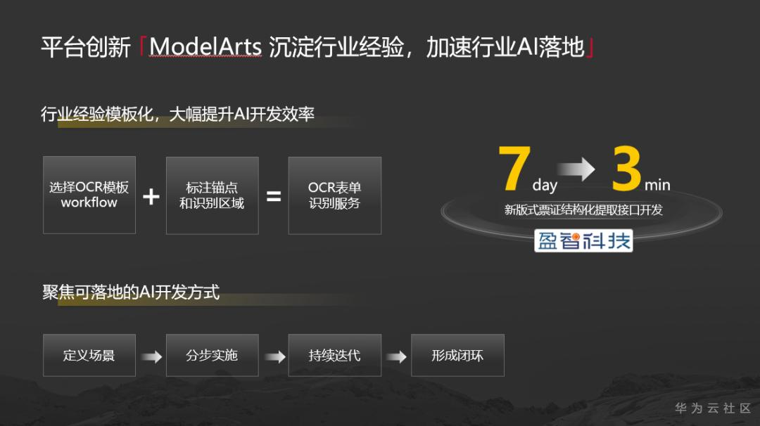 通过华为在 2B 行业的持续累积,华为云一站式 AI 开发管理平台 ModelArts 内沉淀了丰富的行业 know-How 知识,ModelArts 创新提供流程式 AI 开发模式,通过简单的工作流编排即可快速实现 AI 服务上线,将行业 AI 开发经验模板化,行业企业利用模板化的视觉套件,NLP 套件,OCR 套件, 知识图谱套件可以实现 AI 服务快速上线,大幅提升 AI 开发效率。极大降低企业在 AI 应用的难度,加速 AI 应用落地。某种程度上说,ModelArts 已经不止是一站式 AI 开发管理平台,更是一个「企业级 AI 开发平台」。