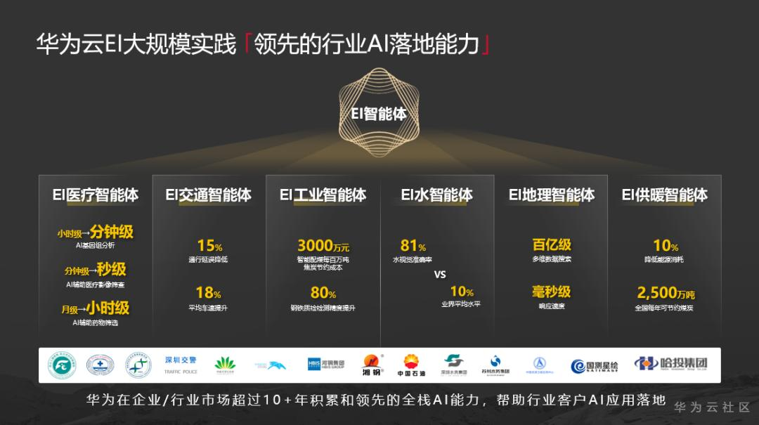 得益于华为在行业领域有超过 10 年的技术积累,华为云 EI 智能体基于华为云通用 AI 服务、ModelArts 一站式 AI 开发平台的强大 AI 能力,与合作伙伴和客户共同进行了广泛的行业 AI 落地实践,已在多个行业取得巨大进展和丰富成功经验。