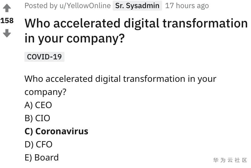 近期,在reddit上有个很火的问题“谁加速了企业的数字化转型?”答案不是CEO,也不是CTO和CFO,而是Coronavirus (新冠病毒),虽是一个玩笑,但却很生动的描述了当下的现状。