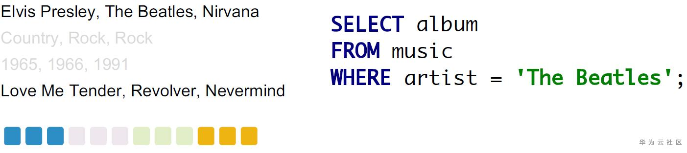 在上图的music表中,如果用列存和行存存储会得到下面两种不同的组织方式。在左边的列存中,同一列的数据被组织在一起,当一列数据存储完毕时,接着下一列的数据存放,直到数据全部存好;而在行存中,数据按照行的顺序依次放置,同一行中包括了不同列的一个数据,在图中通过不同的颜色标识了数据的排列方法。