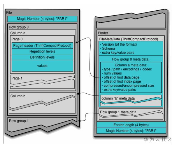 在Parquet中,首尾都是parquet的magic number,用于检验该文件是否是一个parquet文件。Footer放在文件的末尾,存放了元数据信息,这里包括schema信息,以及每个row group的meta data。每个row group是一系列行数据的组成,row group中的每个column是一个列。