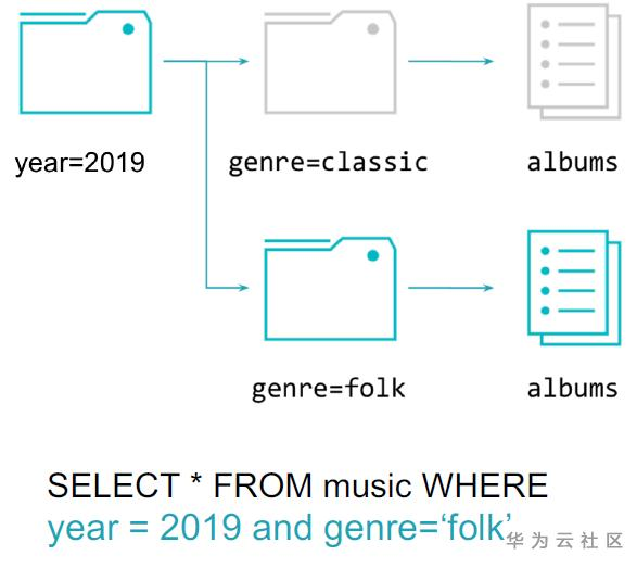 分区(Partition)是指当数据量很大时,可以按照某种方式对数据进行粗粒度切分的方式,比如在上图中按year字段进行了切分,在year字段内部,又将genre字段进行了切分。这样带来的好处也是显而易见的,当处理“year = 2019 and genre = ‘folk’”的查询时,就可以过滤掉不需要扫描的数据,直接定位到相应的切片中去做查询,提高了查询效率。