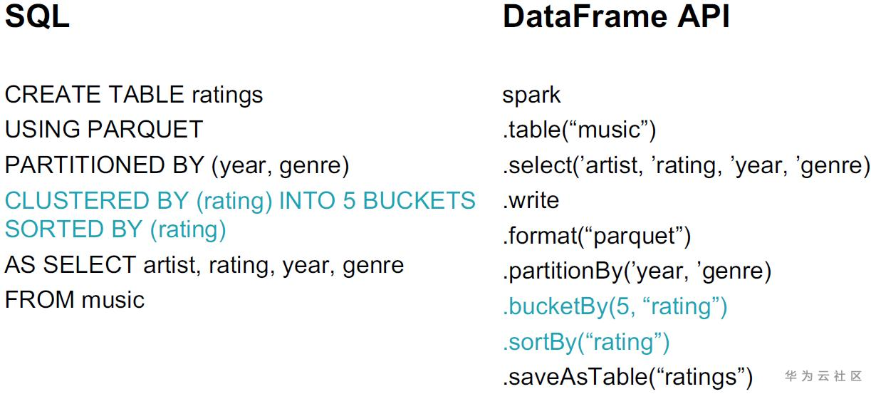 在Spark SQL和DataFrame API分别提供了相应的创建分桶的方式。通过排序,我们也可以记录好min/max,从而避免读取无用的数据。