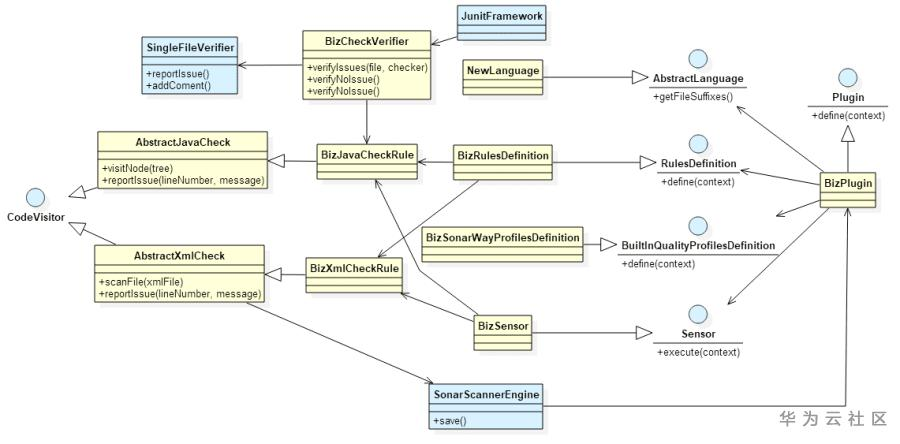 对于新的语言检查扩展,主要实现插件注册类、规则定义、规则集配置、语言类型、执行代理五个基础公共类,在RulesDefinition和Sensor类中加载具体的检查规则类。