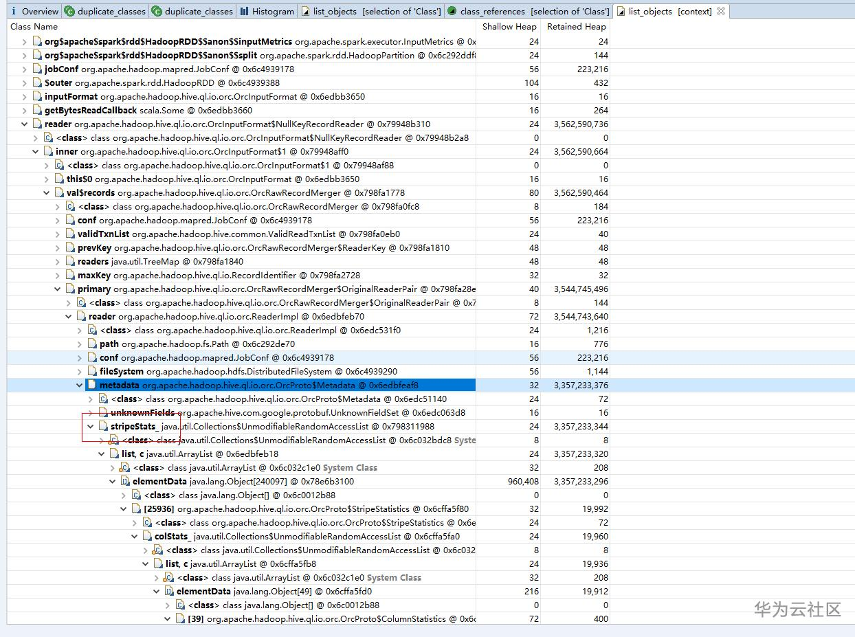 分析dump文件找出占用超大堆内存的具体原因,metadata中的stripeStats占用的堆内存巨大,通过ORC文件的结构可以得出,orc文件的stripe数量过多,导致读取orc文件时的metadata占用超大内存。