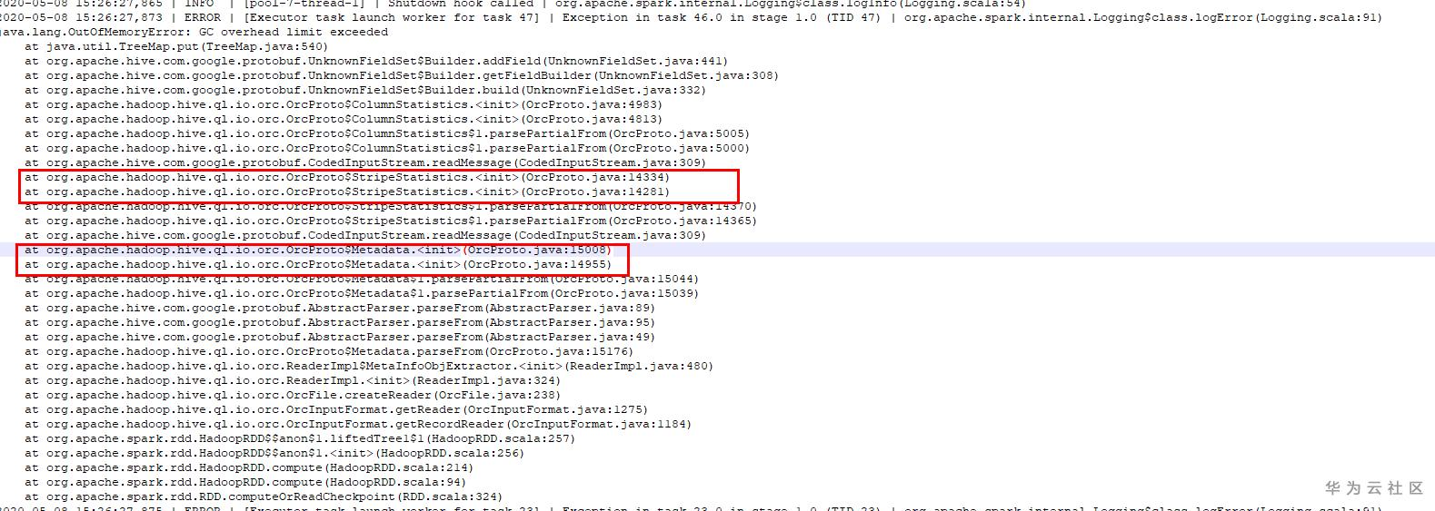 其实,我们根据堆栈异常也可以验证是hive在读取orc文件,初始化Metadata的时候,会以stripe为单位进行元数据的统计,如下异常所示: