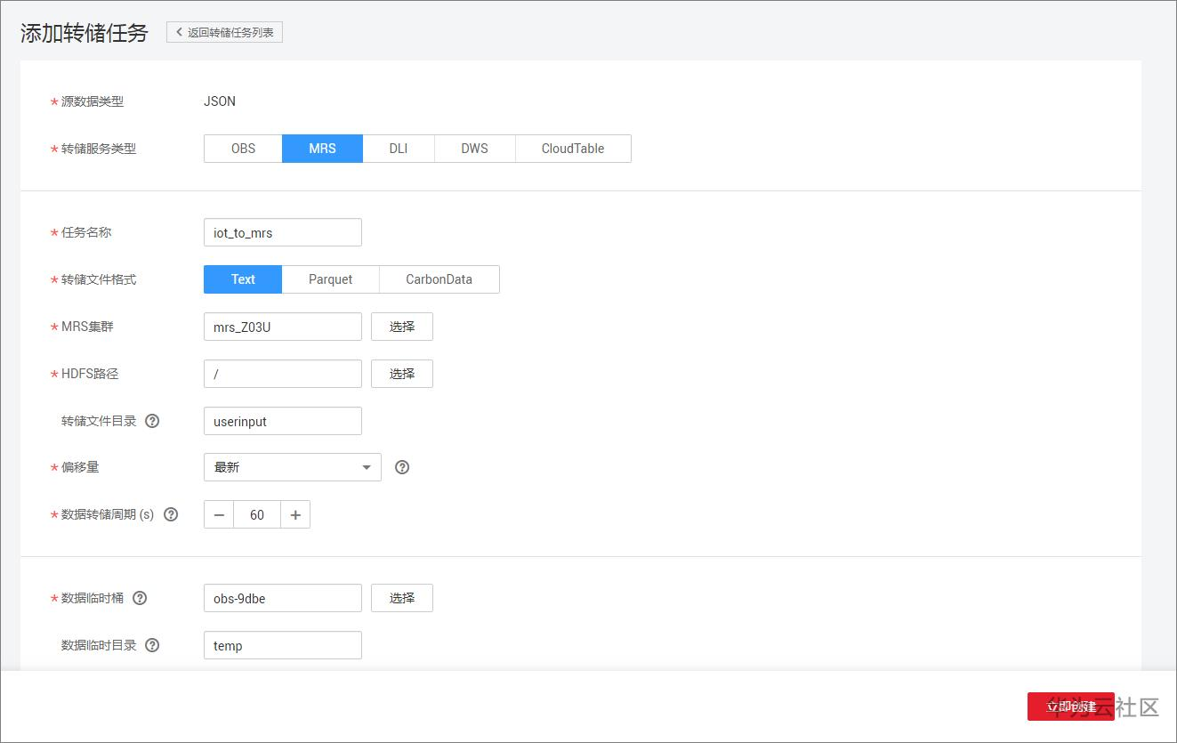 创建通道并配置转储任务,实现将设备管理服务传入DIS的数据转发至MRS。