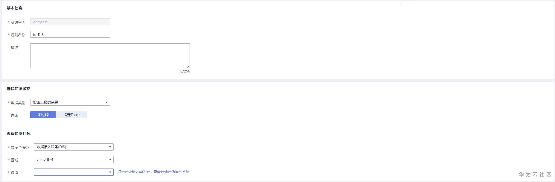 9.填写规则内容,规则名称自定义,“数据类型”选择“JSON”,转发至“数据接入服务(DIS)”,“区域”选择您开通OBS的区域,“通道”选择您创建的桶,填写完成后单击“创建规则”。