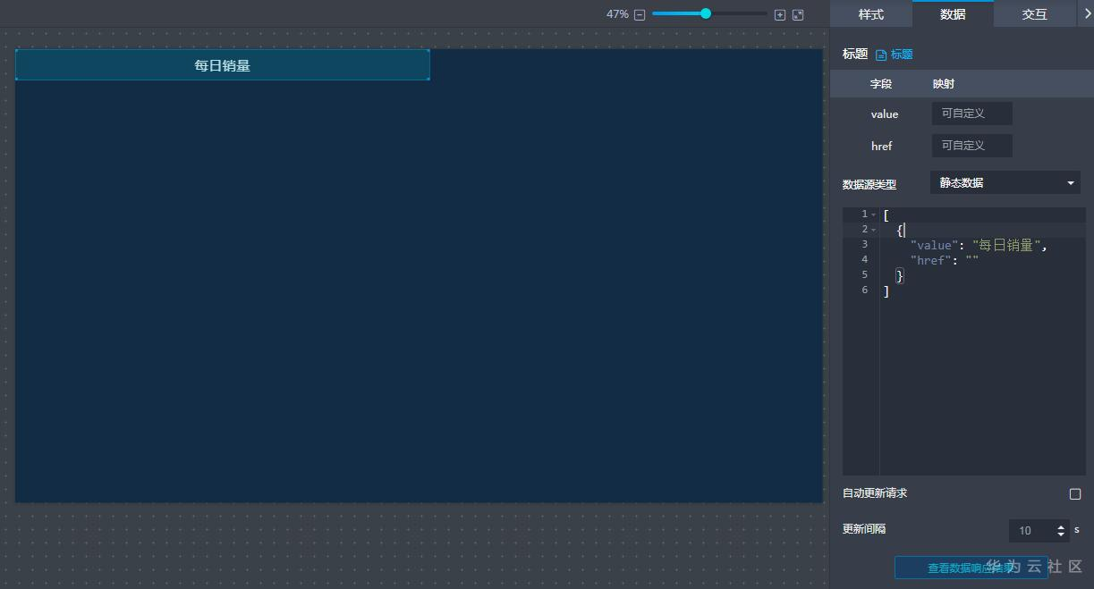 6.在右侧“数据”面板修改静态数据中“value”的值为“每日销量”。