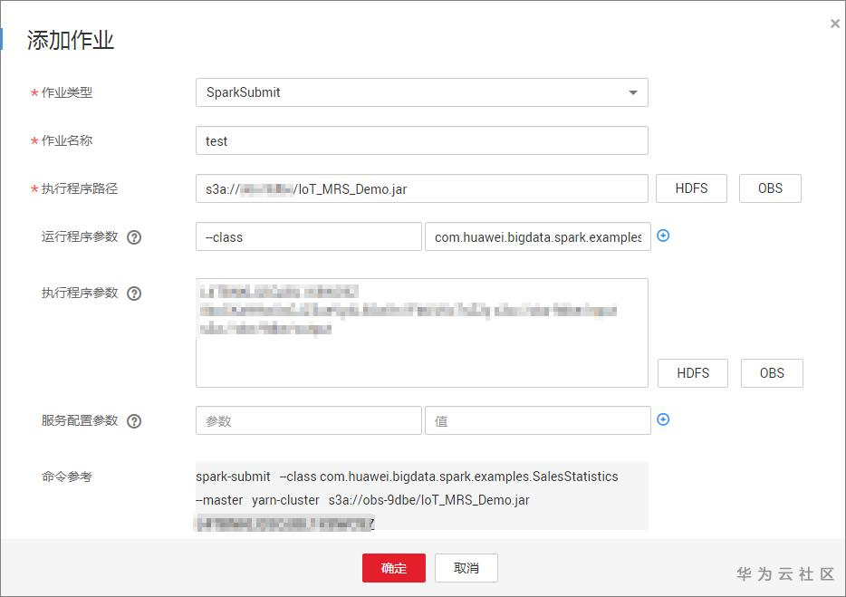 4.单击页面上方的“作业管理”,在“作业”页签中单击“添加”,配置作业信息。本示例中创建一个spark类型的作业,实现分析设备上报数据,分别按日期、时间段、种类、区域统计销量,将分析结果输出为CSV文件并保存至OBS。