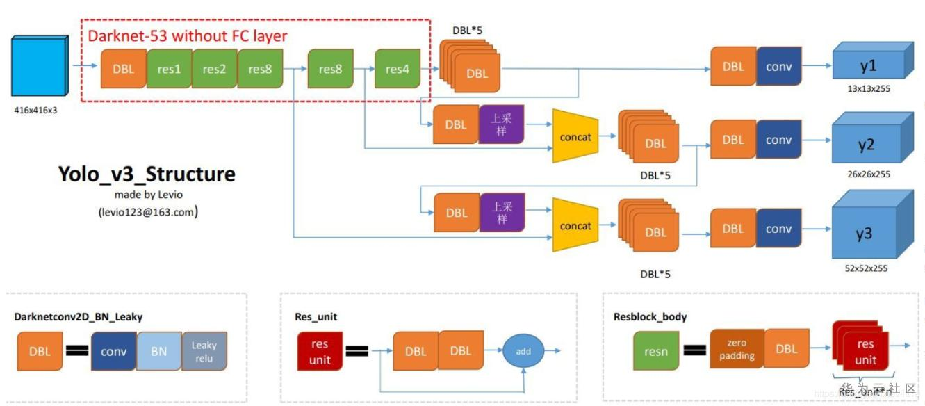 是的,没错,这张图是我在博客上看到的,附博客链接:https://blog.csdn.net/leviopku/article/details/82660381,这篇博客解析了YOLOv3,写的不错,大家可以看看。在博客中,作者总结了YOLOv3的特点,如下: