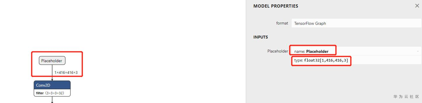 下面是模型转化,通过Netron可以看到模型输入节点为Placeholder 输入为1, 416,416,3。这表示模型输入为一张图片,图片为416*416大小,3通道,也就是我们常用的RGB格式。