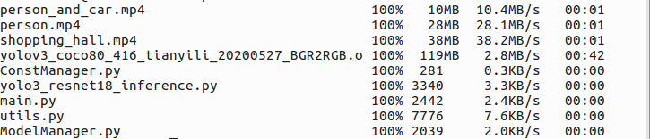 注意,我是在YOLOv3_COCO文件下目录下使用的命令,所以直接用文件夹名字就行,否则需要指定路径,使用的是USB连接开发板,如果用网线连接,IP可能不同,更多拷贝文件的方法,请参考博文每天进步一点点——使用scp命令在Atlas 200 DK和虚拟机之间传输文件(文件夹)