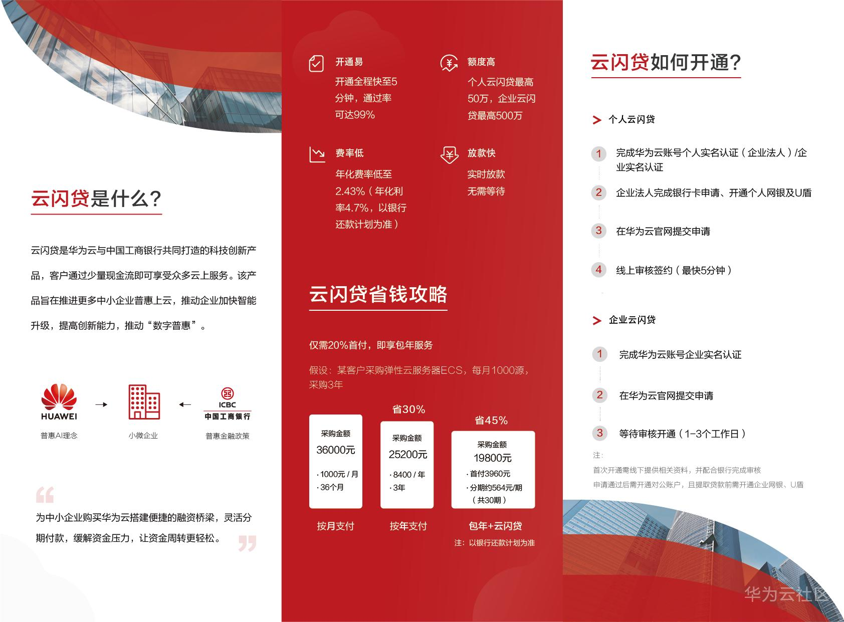 云闪贷是华为云与中国工商银行合作推出的一项贷款服务,20%首付助力小微企业轻松上云,额度最高500万,年化费率低至2.43%,具有“开通易、额度高、费率低、放款快”等优势。
