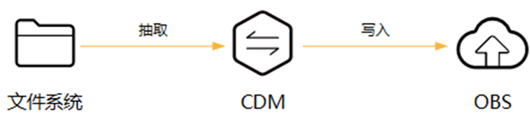 CDM数据迁移以抽取-写入模式进行,CDM首先从源端抽取数据,然后将数据写入到目的端。在迁移文件到OBS时,迁移模式下图所示。