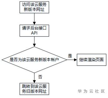 为了保障业务的连续性,在没完成将所有租户从旧版本迁移到新版本的割接之前,该云服务必须满足线上同时支持新旧版本。新旧版本在线上运行,分别对应一套控制台console。站在客户的角度,如果客户以前使用的是旧版本,那么在访问该云服务的时候,需要跳转到旧版本的控制台;如果是新客户,以前没有使用过旧版本,登陆华为云之后访问该云服务,则需要跳转到新版本的控制台,具体的实现,描述如下: