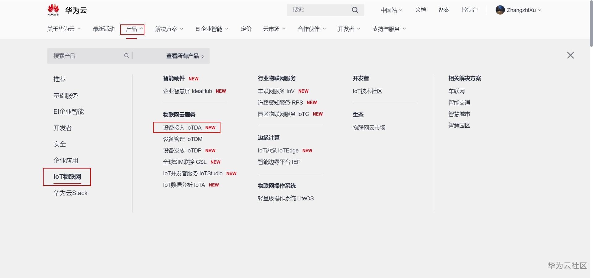 点击华为云首页"产品",显示下拉菜单如图所示,选中左侧的"IoT物联网",并选择物联网云服务菜单中的"设备接入 IoTDA"功能插件