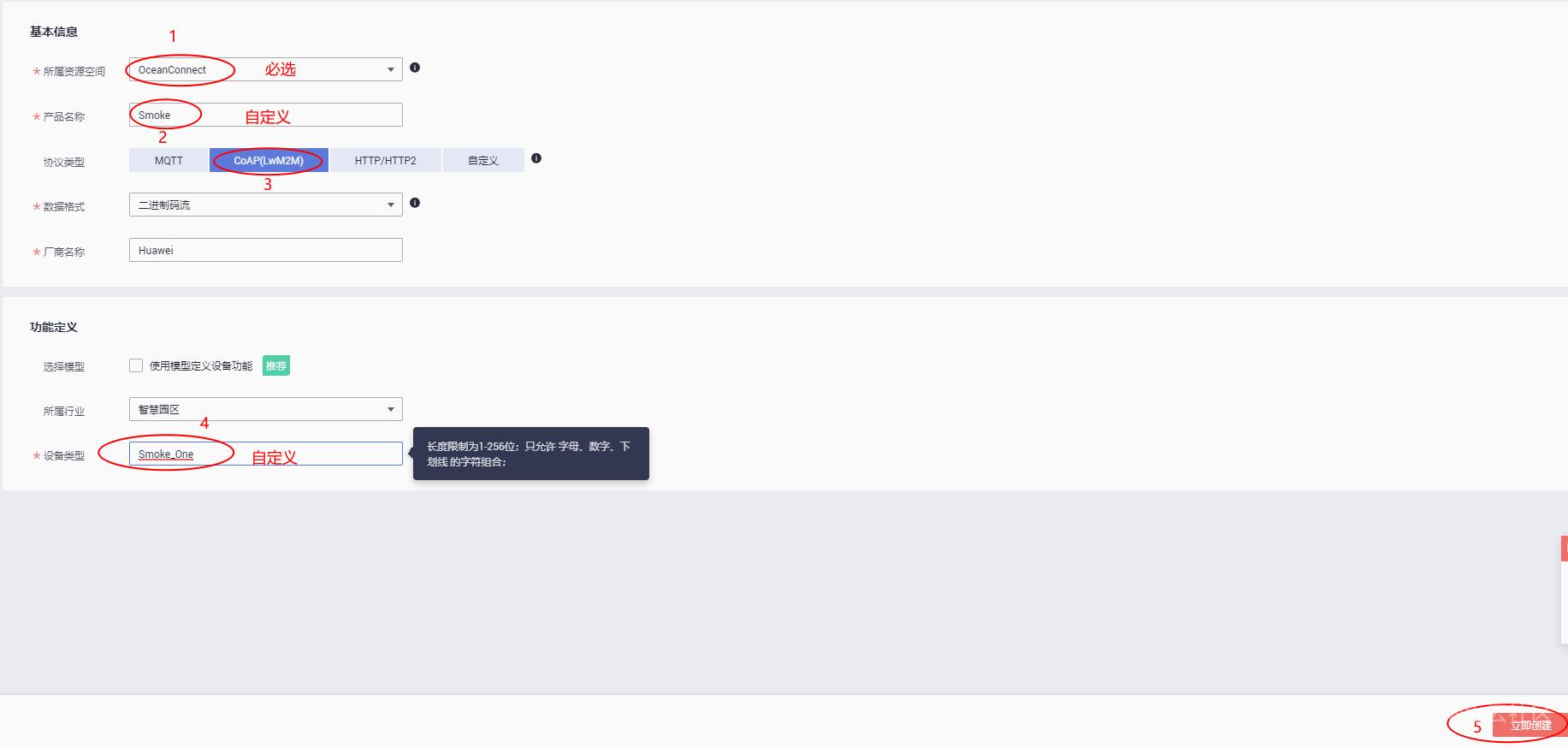 点击左侧产品选框,弹出产品界面,并在右上角选择创建产品,弹出创建产品页面,依次填入基本信息和功能定义,填写完成后,点击右下角"立即创建",完成产品创建