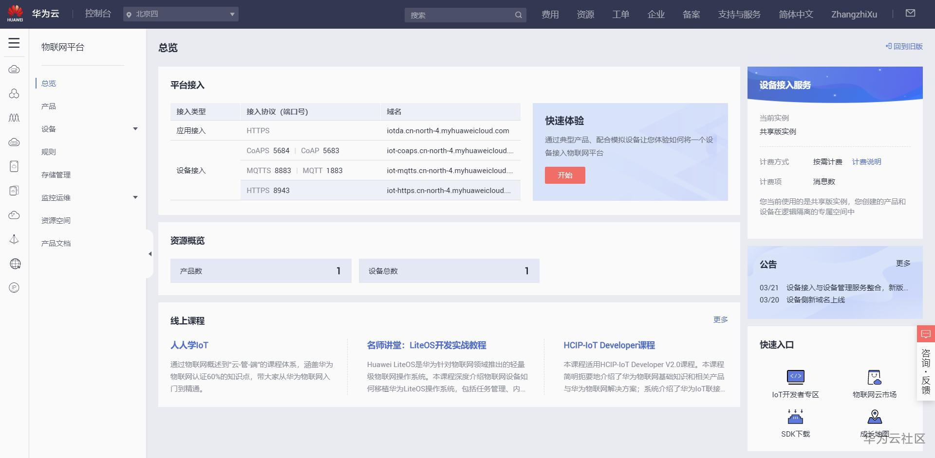 打开IoTDA界面。首先,映入眼帘的是总览页面,在这里特别需要注意的是平台接入,不同的对接协议有不同的端口号,在后期的开发中一定要慎重选择