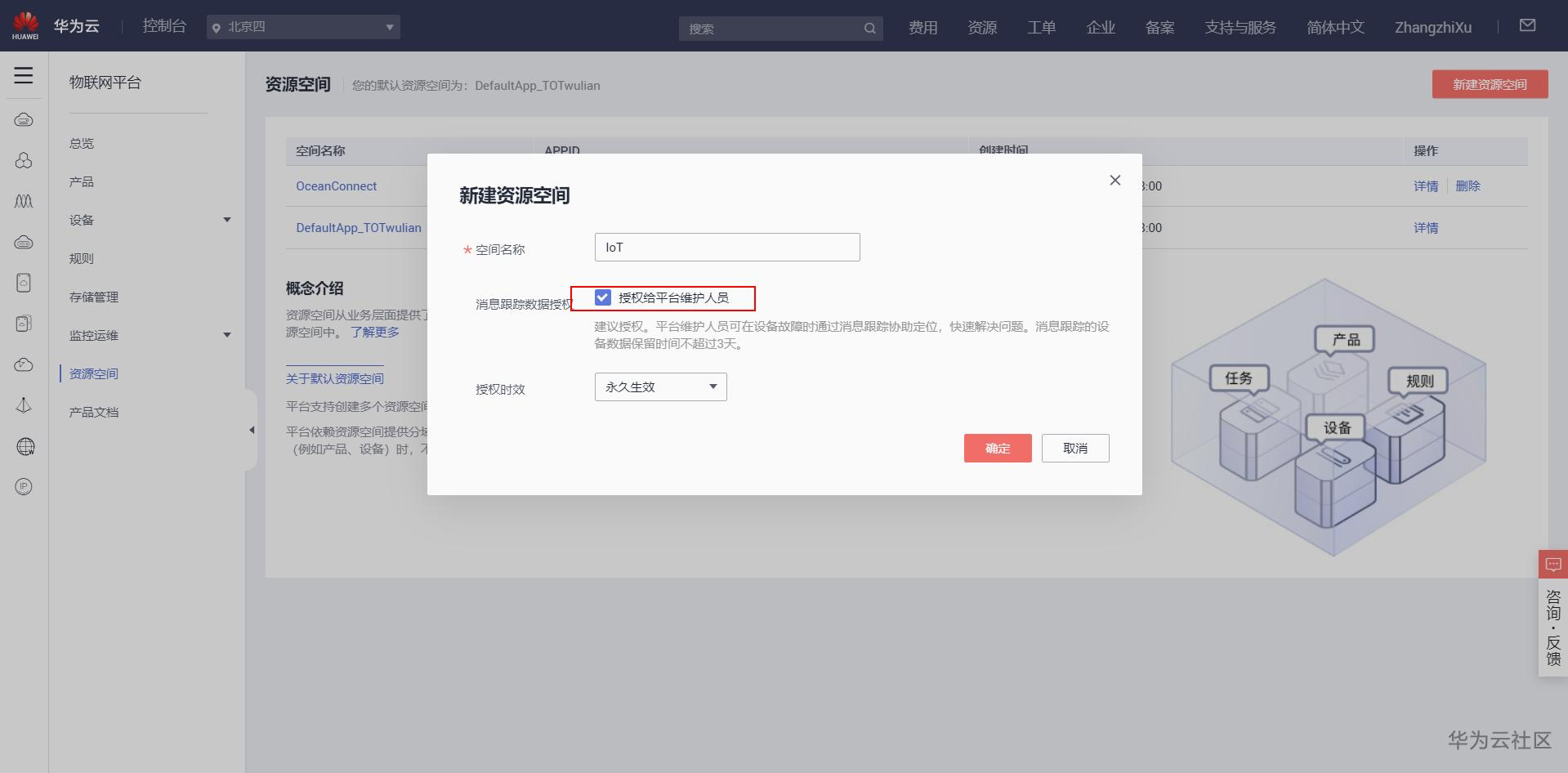 点击左侧资源空间选框,弹出资源空间界面,并在右上角选择创建资源空间,弹出新建资源空间弹窗,在弹窗内自定义资源空间名称,并授权给平台维护人员,设置时效为永久生效,点击"确定"