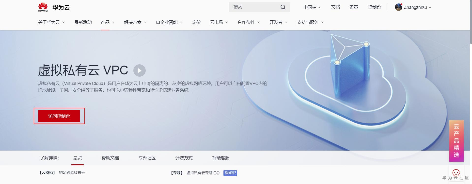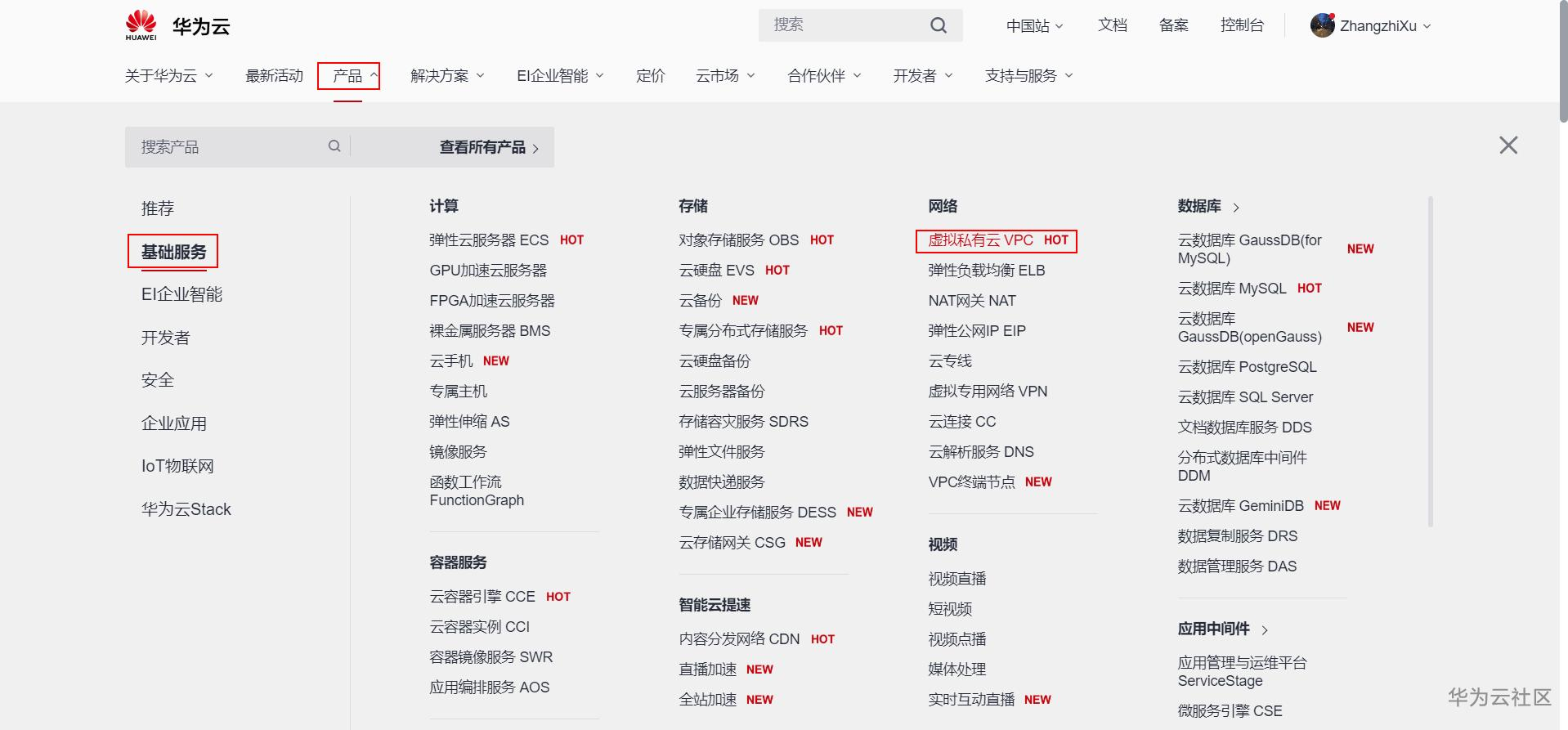 点击华为云首页"产品",显示下拉菜单如图所示,选中左侧的"基础服务",并选择网络菜单中的"虚拟私有云 VPC"功能插件