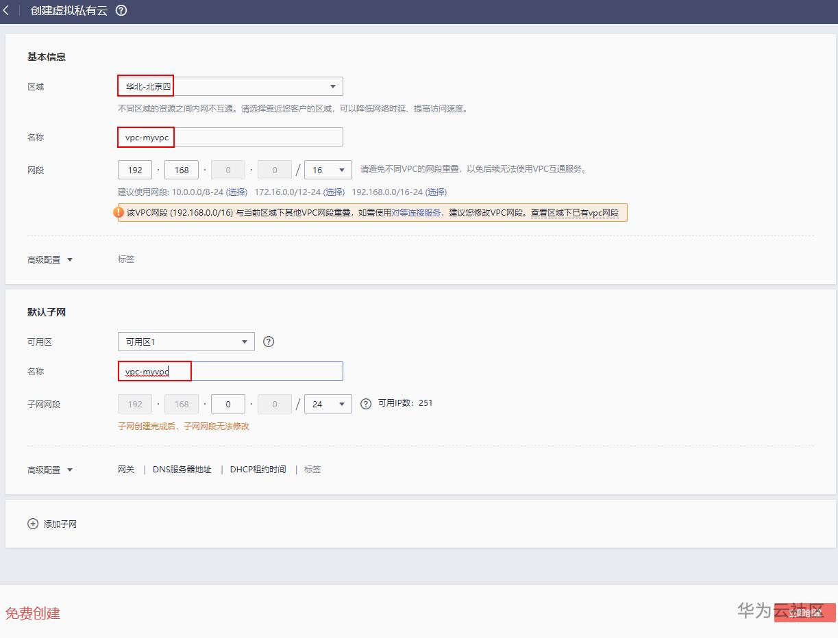 在弹出的创建页面选择区域、填写基本信息名称和默认子网名称,并在右下角点击立即创建