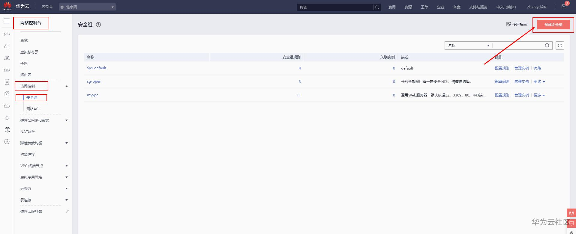 打开安全组界面,点击右上角,创建安全组