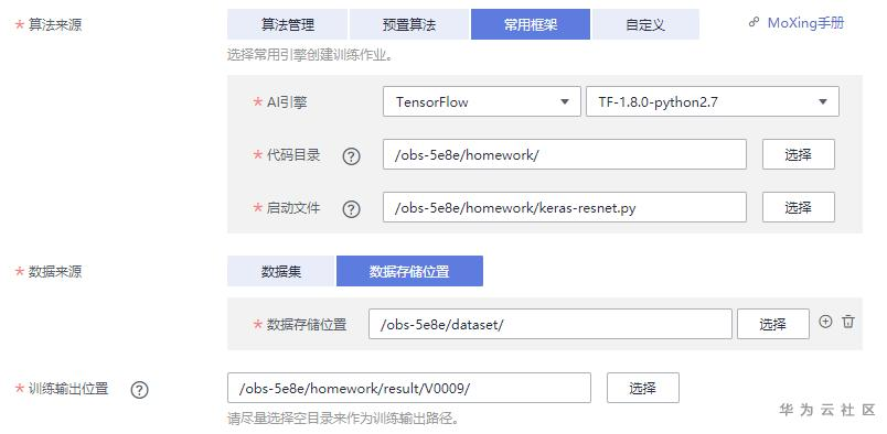 如下截图中,obs路径就是/obs-5e8e/homework/。ModelArts会将“代码目录”这个obs路径下的所有文件都下载到训练容器的/home/work/user-job-dir当中,创建一个/home/work/user-job-dir/homework的路径。所以启动文件在训练容器中的路径就是/home/work/user-job-dir/homework/keras-resnet.py。