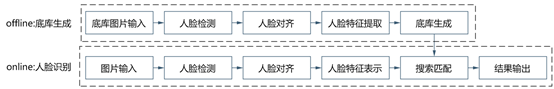 如下图9所示,整体算法实现的流程分为线下和线上两个部分,在每次对不同的人进行识别之前首先利用训练好的算法生成人脸标准底库,将底库数据保存在modelarts上。然后在每次推理的过程中,图片输入会经过人脸检测模型和人脸识别模型得到人脸特征,然后基于该特征在底库中搜索相似对最高的特征,完成人脸识别的过程。