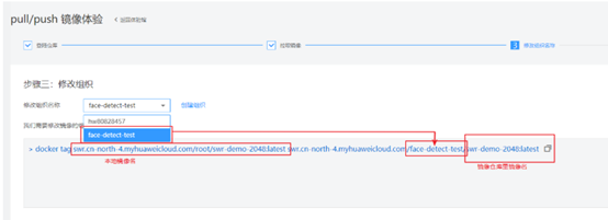 第三步修改组织,使用根据产品文档创建的组织名。在这一步需要将本地的一个镜像重命名为云上识别的镜像命。具体看下图解释: