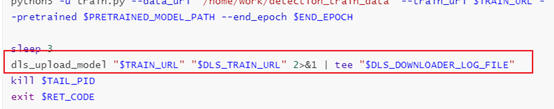 如果需要上传训练结果或者模型到OBS,需要参考”dls_get_app”加”dls_upload_model”的命令。在我们这次训练中,上传的脚本如下: