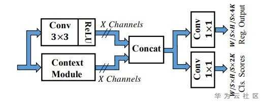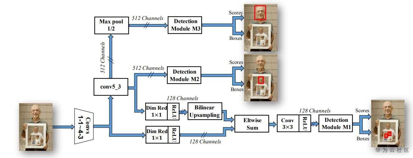 从上图中可以看出,SSH网络已经有对不同网络层输出进行处理的方法,只需要一遍推理就能完成不同大小人脸的检测过程,因此称之为Single Stage。SSH的网络也比较简单,就是对VGG不同卷积层惊醒了分支计算并输出。另外还对高层feature进行了上采样,与底层feature做Eltwise Sum来完成底层与高层的特征融合。另外SSH网络还设计了detection module和context module,其中context module作为detection module的一部分,采用了inception的结构,获取更多上下文信息以及更大的感受野。