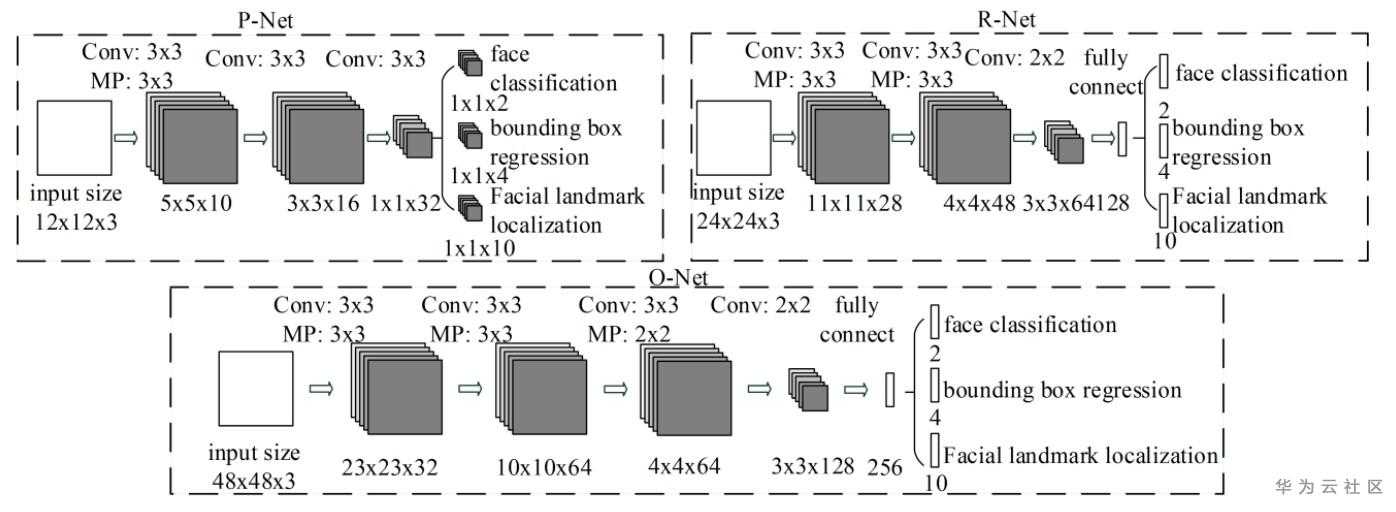 MTCNN是一个多任务的方法,第一次将人脸区域检测和人脸关键点检测放在了一起,与Cascade CNN一样也是基于cascade的框架,但是整体思路更加的巧妙合理,MTCNN总体来说分为三个部分:PNet、RNet和ONet,网络结构如下图4所示。