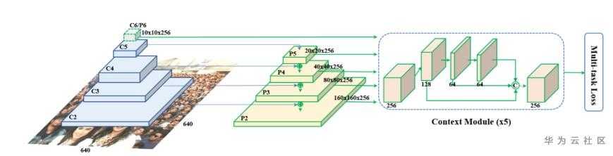 Retinaface由google提出,本质是基于RetinaNet的网络结构,采用特征金字塔技术,实现了多尺度信息的融合,对检测小物体有重要的作用。网络结构如下所示。