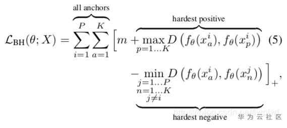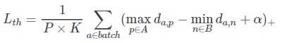 在该片论文中,作者提出了一个TriHard loss,其核心思想是在triplet loss的基础上加入对hard example的处理:对于每一个训练的batch, 随机挑选P个ID的行人,每个行人随机挑选K张不同的图片,即一个batch含有P×K张图片。之后对于batch中的每一张图片a,我们可以挑选一个最难的正样本和一个最难的负样本和a组成一个三元组。首先我们定义和a为相同ID的图片集为A,剩下不同ID的图片图片集为B,则TriHard损失表示为:
