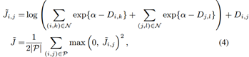 作者在观察constractive loss和triplet loss的时候发现一个问题,就是负样本在非常hard的时候loss函数非常的平滑,那么也就意味着梯度会很小,梯度小对于训练来说就意味着非常hard的样本不能充分训练,网络得不到hard样本的有效信息,因此hard样本的效果就会变差。所以如果在hard样本周围loss不是那么平滑,也就是深度学习中经常用的导数为1(像relu一样),那么hard模式会不会就解决了梯度消失的问题。另外loss function还要实现triplet loss对正负样本的兼顾,以及具备margin设计的功能,也就是自适应不同的数据分布。损失函数如下: