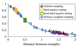 文章指出hard negative样本由于anchor的距离较小,这是如果有噪声,那么这种采样方式就很容易受到噪声的影响,从而造成训练时的模型坍塌。FaceNet曾经提出一种semi-hard negative mining的方法,它提出的方法是让采样的样本不是太hard。但是根据作者的分析认为,sample应该在样本中进行均匀的采样,因此最佳的采样状态应该是在分散均匀的负样本中,既有hard,又有semi-hard,又有easy的样本,因此作者提出了一种新的采样方法Distance weighted sampling。