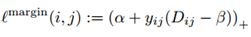 我们称anchor样本与正例样本之间的距离为正例对距离;称anchor样本与负例样本之间的距离为负例对距离。公式中的参数beta定义了正例对距离与负例对距离之间的界限,如果正例对距离Dij大于beta,则损失加大;或者负例对距离Dij小于beta,损失加大。A控制样本的分离间隔;当样本为正例对时,yij为1,样本为负例对时,yij为-1。下图为损失函数曲线。