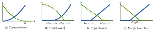 该式子的直观解释为:在特征空间里Anchor与Positive的距离要小于Anchor与Negative的距离并超过一个Margin Alpha。他与Contrastive loss的直观区别由下图所示。