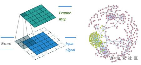 图作为一种通用的数据结构,可以用来刻画现实世界中的很多问题,例如社交场景的用户网络、电商场景的用户和商品网络、电信场景的通信网络、金融场景的交易网络和医疗场景的药物分子网络等等。相比文本、语音和图像领域等易处理成欧式空间的数据而言,非欧空间的图数据(如上右图),无序才是常态。虽然可以用邻接矩阵、度矩阵等来表示图的结构信息,或者节点的特征矩阵等来表示图的属性信息,但如何将二者结合以产生高效的低维空间映射,成为当前图结构数据与CNN之间难以逾越的鸿沟。反过来说,解决这个问题,就架起了图与CNN连通的桥梁。