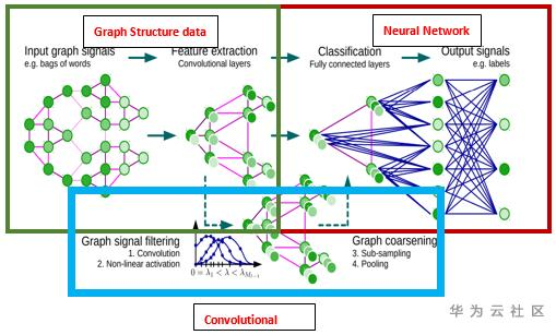 本文无意列举许多关于卷积定义的数学公式,简而言之,卷积运算的实质是加权求和和参数共享。如下GCN流程图所示,从图结构数据到神经网络,卷积操作必不可少,但在图结构中无法运用常规的卷积操作形成Feature Map,需要“特殊设计”。