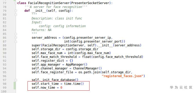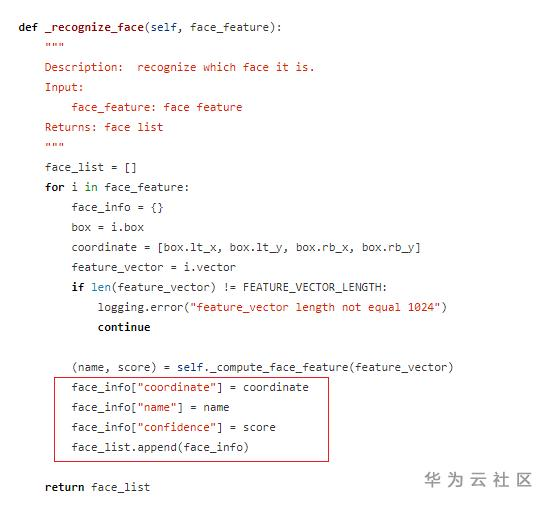 在sample-facialrecognition/presenterserver/facial_recognition/src/ facial_recognition_server.py内发现 _recognize_face(self, face_feature)函数,从函数名可看出这个函数就在做识别人脸的事。