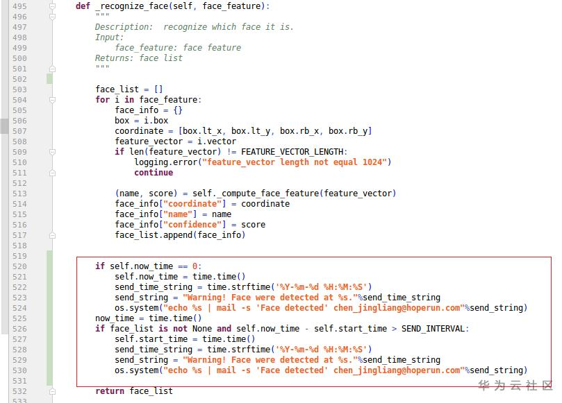 我们的目标是在检测到注册的人脸后发送邮件,那只需找到对应功能的代码位置,在其后添加发送邮件的指令即可完成任务。