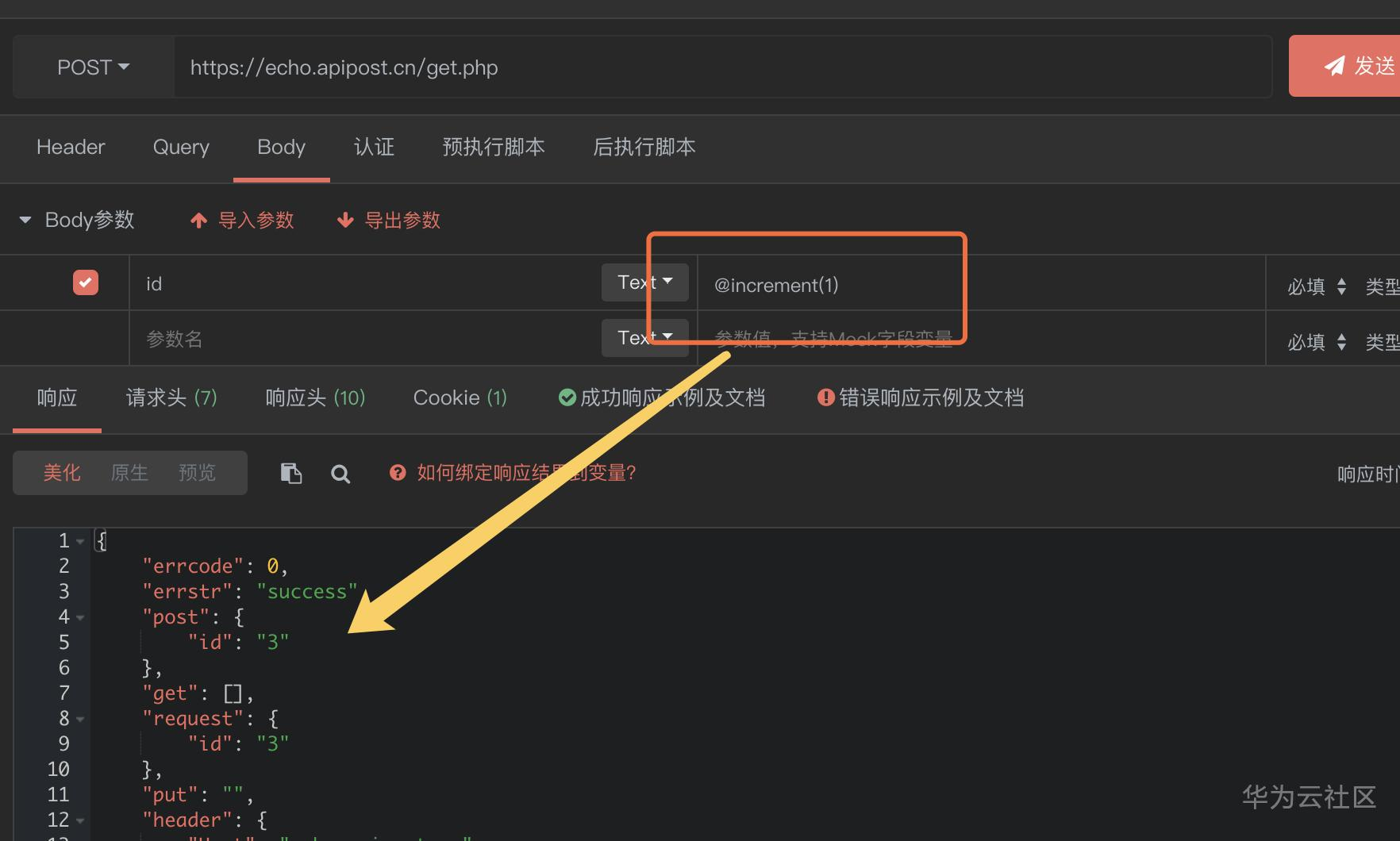 以下图中,我们利用mock的内置变量 @increment(1) 生成了一个每次自增1的主键,每次发送,对应ID的值都会自动+1。