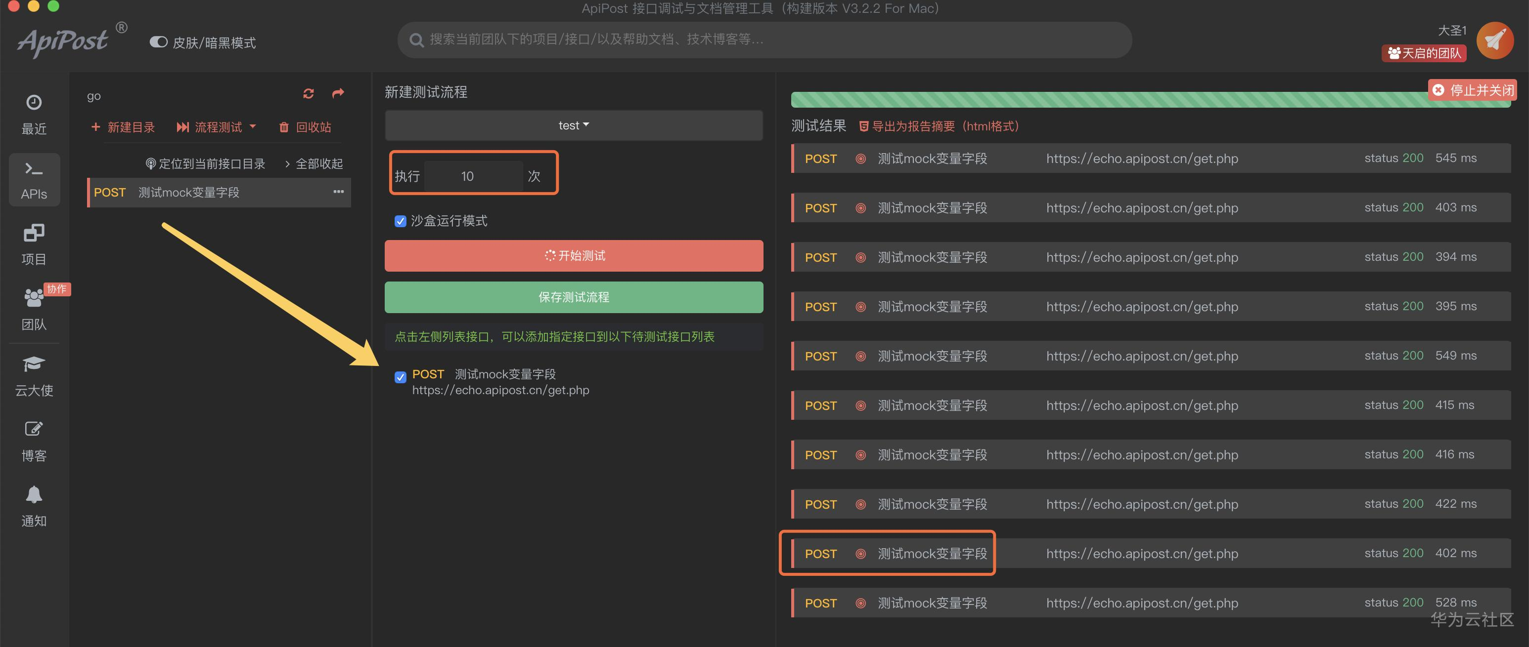 这个时候,我们就可以利用mock生成我们需要的数据,并结合ApiPost内置的流程测试功能进行接口的测试。