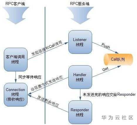 客户端发起的RPC调用是同步的,而服务端处理RPC调用是异步的。客户端调用线程以阻塞同步的方式发起RPC连接及RPC调用,将参数等信息发送给Listener,然后等待Connection接收响应返回。