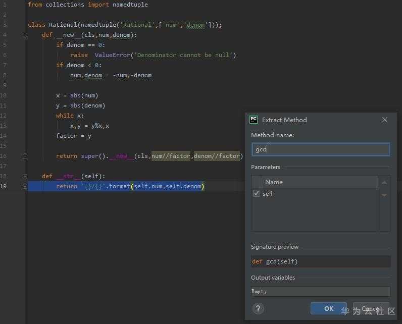 现在我们将最大公约数提取到单独的方法中,选中上面这张图中的10-14行代码,点击‘重构’按钮。